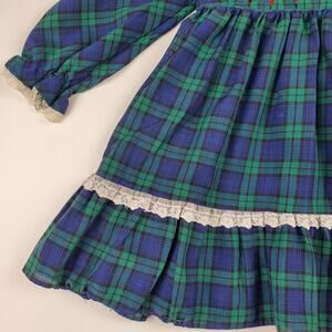 Polly Flinders Vintage Hand Smocked Dress Plaid Lace Floral Green Blue Girls 4