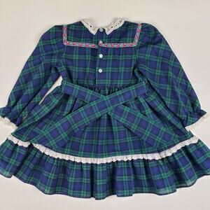 Features lace collar neckline, hand smocking, ruffle lace trim accents, green and blue checkered / plaid design, floral / rose flowers accents, adjustable waist tie and back button closure, made in USA,