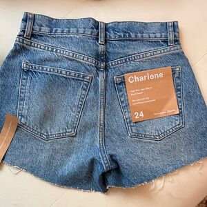 Chic light blue jean shorts by Reformation. Features a classic cut with frayed hem. Ideal for casual wear.