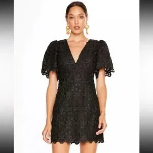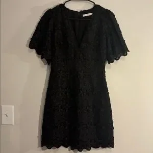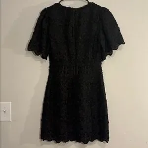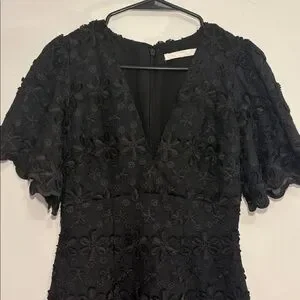 Gorgeous black dress with monochrome to textured black floral daisy overlay embroidery all over. Back fully unzips. Dress does not seem to have stretch! Scalloped embroidery overlock hem. V neckline and flattering darter empire waist. XS, excellent condition