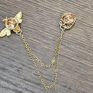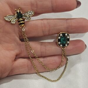 Elegant gold chain brooch with a bee and green gemstone design. Perfect for adding a touch of charm to any outfit.