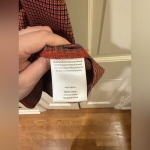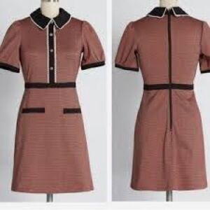 Gently worn ModCloth Scholastic Classic mod 60s dress in red/black/tan print with black collar and button placket. Faux pockets, dress zips up the back, and is unlined. There is some stretch.