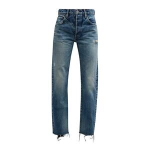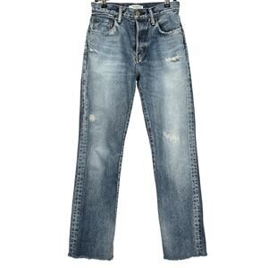 Moussy 'Mv' Blue Cotton Sundown Straight Jean Size 23: heavyweight, non-stretch denim, cowhide leather patch, frayed cuffs and distressed patches, full length, button fly, 5-pocket styling.