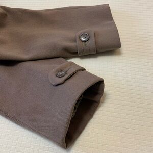 Vintage camel colored 100% wool coat from London Fog. Tempo Europa style. Collared neckline has buttoned opening. Structured shoulder pads. 4 hidden button closure on front. Fantastic tucked pleat on back with a 22” button adorned tie accent. 2 front pockets. Fully lined. Heavyweight. Button accents on cuffs. Attractive shoulder seams. Size 8; fits TTS. Worn minimally. Very well cared for. Freshly dry cleaned and ready to wear! Excellent condition! HL:65