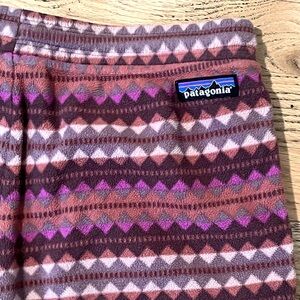 Comfy mid-rise fleece joggers made from lightweight double-sided 100% recycled polyester Micro D fleece. Elasticized waistband with drawcord for adjustable and comfortable fit. Elastic bottom hem cuffs and side pockets. VGUC! In mauve/pink/brown/purple pattern (Sorry, do not know the official Patagonia color.)