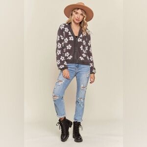NWT Boutique Mae Charcoal Fuzzy Floral Cropped Cardigan Sweater
