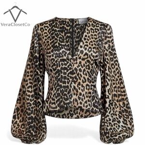 Stunning GANNI leopard-print blouse crafted from a luxurious 92% silk / 8% elastane satin-finish fabric. Features signature covered buttons down the front, soft puff sleeves, and a flattering, slightly structured silhouette.