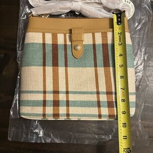 Stylish plaid crossbody purse. Brand new Spartina purse with tan, cream, baby blue, and brown colors in a plaid pattern. There are two outside pockets along with inserts in the main compartment. Perfect for everyday use.