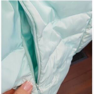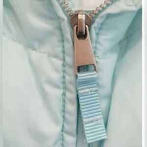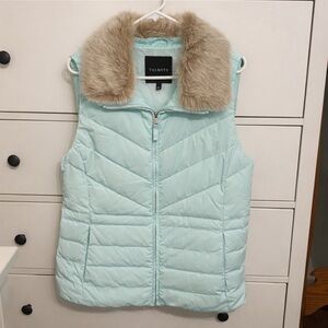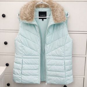 Chic down puffer vest by Talbots. Light aqua with a removable plush faux fur collar. Ideal for layering.
