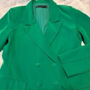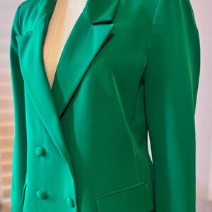 Vibrant green double-breasted blazer with a structured fit. Features matching fabric-covered buttons and front flap pockets. Chic, bold, and perfect for elevating any outfit.