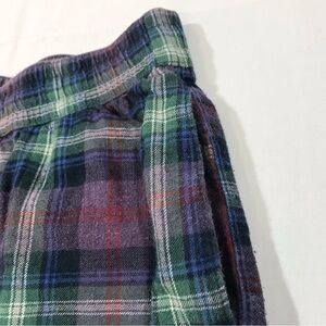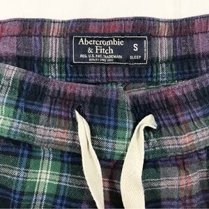 The product is a pair of Abercrombie & Fitch men's small plaid lounge pants in a relaxed fit with a drawstring closure. These lightweight and comfortable pants feature a mid-rise waist and a 27-inch inseam, perfect for casual or travel occasions. Made from cotton flannel fabric, these pants also have adjustable waist and back pockets, making them a versatile and stylish addition to any wardrobe for the various seasons. The preppy and Y2K themed pants are machine washable and easy to care for.