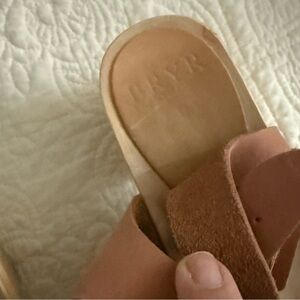 Gorgeous clay nubuc leather Bryr Clogs sandals with an ankle buckle. Wood heel Handmade in San Francisco. Retired style but so classic. Fits a size 9.