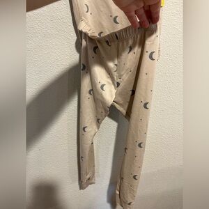 Beige tan and grey graphic moon and star print. Soft and stretchy material. Short sleeve pajama top with jogger style pajama pull on pants.