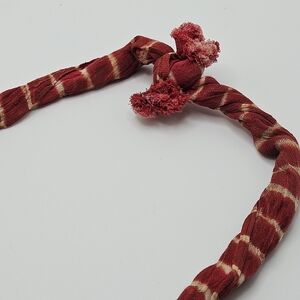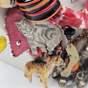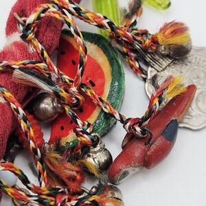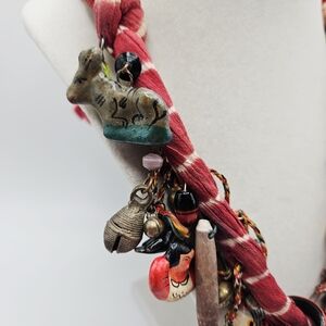 Vintage handcrafted Chachkas charm necklace. Red and white dyed fabric with dozens of mixed charms and trinkets attached. Includes monkey, cat, watermelon, shell, fish, bird, coin, bell, heart, mixed beads, and more. Such a unique piece for a collection. Measures about 28" long (a little longer counting bottom charms). Purchased from an estate collection and no visible maker's mark. Excellent condition and smoke-free home.