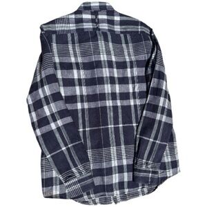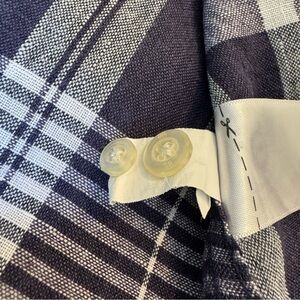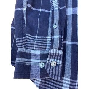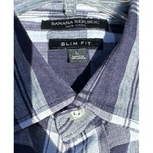 Classy dress shirt, this long sleeved Banana Republic Slim Fit Men's, Size L, will give style to your wardrobe. Slim fit sits close to the body with a straight silhouette. 100% Linen. Button up. Blue and white striped pattern. Cuffs offer two button options to size correctly to your wrist. Two extra buttons sewn onto the inside tab, see photo.