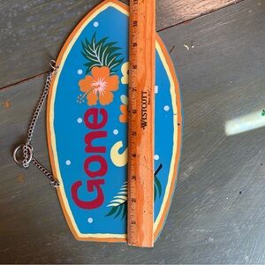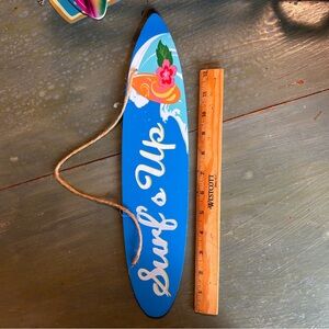 Set of three surfboard-shaped wall decor hanging signs.. Features vibrant designs with phrases like 'Surf's Up' and 'Gone Surfin'. Perfect for beach-themed decor. 1 is made of wood, 1 is metal, and 1 is plastic. You will receive all 3.