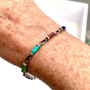 This petite/slim multi stone sterling link bracelet is marked 925 and is hallmarked MO for the artist. This beauty weighs 10.7g and measures 8” displaying 11 brightly colored gemstones.