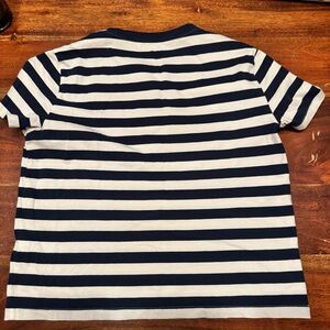 Soft, short-sleeve, Everlane box-cut tee. Navy and cream striped with navy collar. Organic cotton, machine wash cold, tumble dry low.