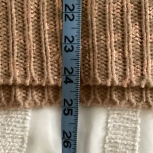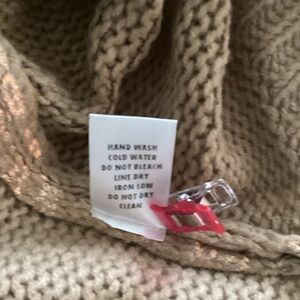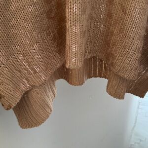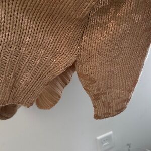 This is a cozy, oversized sweater in a warm, golden beige color with a subtle animal print (possibly leopard) design. It features a slightly loose knit with shiny metallic threads woven throughout, giving it a soft shimmer and an elevated look. The sweater has a wide ribbed neckline, cuffs, and hem, adding structure to the otherwise relaxed fit. The label is ANOTHERWAY" and the size is Medium. This piece is perfect for dressing up casual outfits or adding some sparkle to fall and winter wardrobes. Measurements in the pictures.