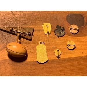 A unique collection of vintage pins and badges featuring gold and tan colors. Perfect for collectors.