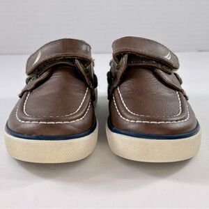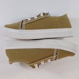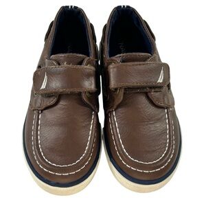 BUNDLE Oomphies canvas low-top slip-on sneakers, color tan & denim blue have elastic ties for easy on & off, textile lining, foam footbed and PVC sole. Nautica boat shoes, color dark brown, have a velcro closure and nonskid soles. Both sets are size 8 Toddler Boys’. Shoes are gently used in very good condition.