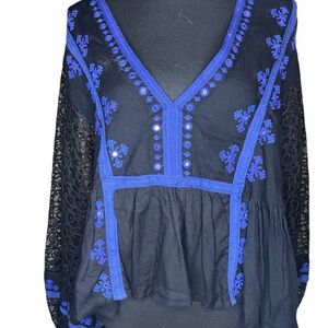 Elegant black blouse with intricate purple embroidery. Features long lace sleeves and a deep V-neckline. Perfect for a stylish look.