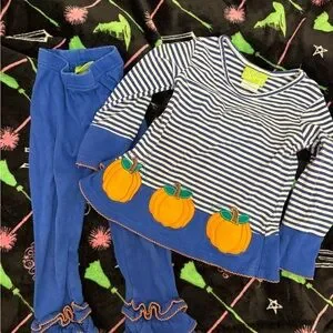 Get your little one ready for fall with this charming blue striped set featuring playful pumpkin appliqués. Perfect for festive fun and comfort.