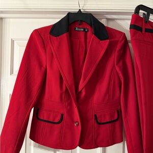 Elegant red blazer featuring a sleek black collar. Ideal for professional settings. Please note the pants are a size 10 and the top is a size 12