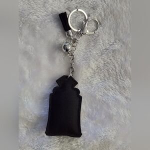 Sparkling rhinestone keychain in the shape of a perfume bottle. Features black, silver, and pink accents. Perfect for adding a touch of glamour to your keys.