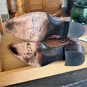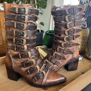 Freebird by Steven Stoke Tan Brown Distressed Leather Rusty Buckle Boots 8 in EUC! These are soooo good! I need a 9 or 10. I’m a true 9 and a 9.5 in pointy toe. I tried to make these work and they are just too tight. I am so bummed. If you gave a 9 or 10, please lmk. Smoke free. Thanks!
