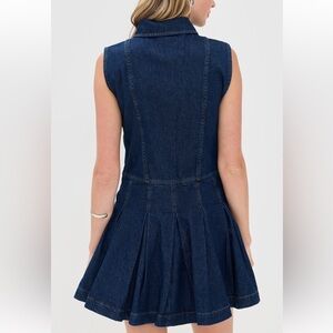 Stylish mini dress with a sleeveless design. Features a button-up front and pleated skirt. Perfect for day or night.