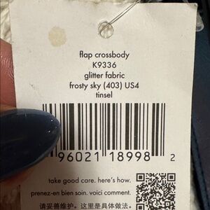 Stunning Kate Spade Flap Crossbody in the shade Frosty Sky (403) with gorgeous all-over glitter fabric. This style (K9336) is lightweight, eye-catching, and perfect for special occasions or adding sparkle to everyday outfits.