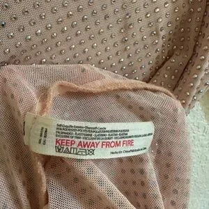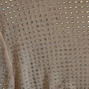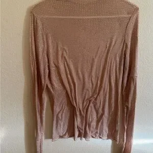 Intimately Free People “Dance All Night” long sleeve top in a soft peach color. Sparkly, sheer, form-fitting mesh with rhinestone embellishments throughout. Features a mock neckline, fitted sleeves with thumb holes, and delicate lettuce-edge trim. A stunning statement piece layered over bralettes, camis, or your favorite night-out essentials.