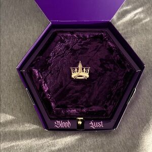 Hexagonal purple palette with gold crown design. Perfect for makeup enthusiasts.
