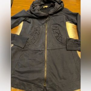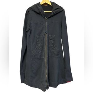 Prairie Underground classic first introduced in 2006 and one of our longest-running styles. Dramatic fit and flare shaping with seamless sides and back belt inset. Ultra femme design lines and pockets embellished with gathered muslin insets are balanced by extra-long sleeves that can be gathered along the arm, or worn over the hand in cooler climes. When unzipped the hood may be draped over the shoulder.