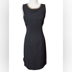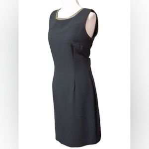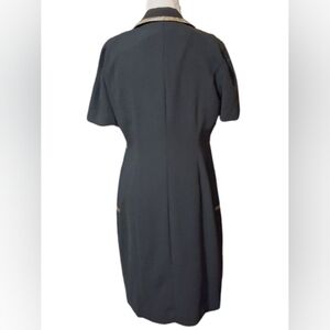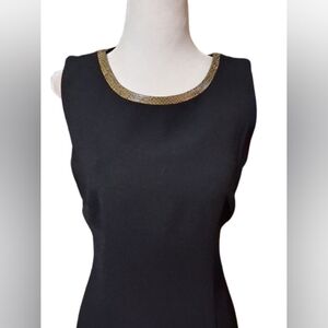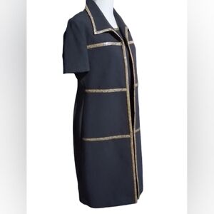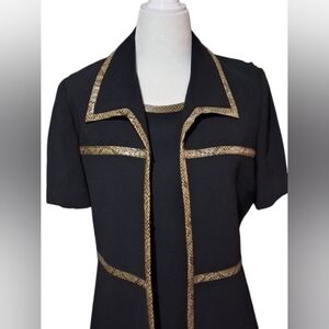 This sophisticated black dress features elegant gold accents, and separate long gold accented, short sleeve jacket. Perfect for any formal occasion. Its timeless design ensures you stand out with style and grace.