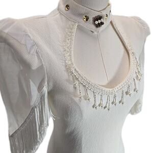Vtg Joy USA White Ribbed Bodycon Dress Sz M Fringe Beaded Collar Dolly Parton