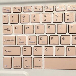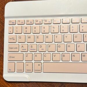 Stylish wireless keyboard in white and pink. Compact and portable design.