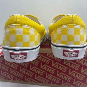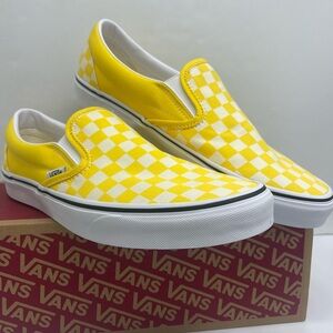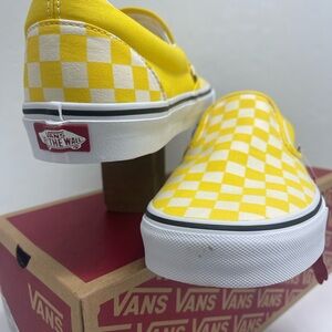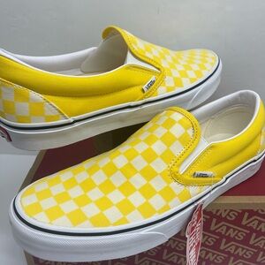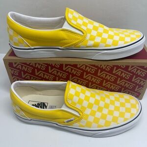 Bright yellow and white checkered Vans slip-ons. Classic and trendy design.