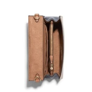 Chic Coach crossbody with blue and tan leather. Stylish buckle detail. Perfect for versatile wear.