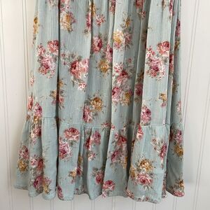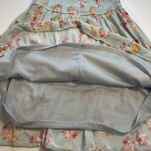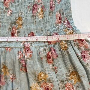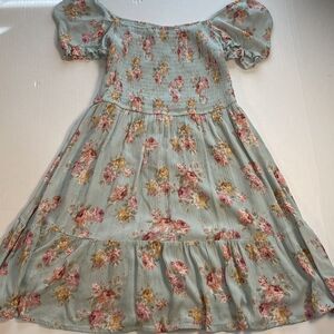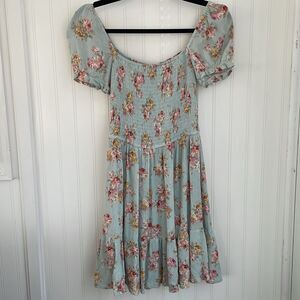 In excellent preowned condition! Beautiful floral mini dress with smocking across the bodice and puff sleeves that can be worn on or off the shoulder. The dress is lined from the waist down and has a tiered skirt. Perfect peasant Boho milkmaid style! Great for Easter and spring!