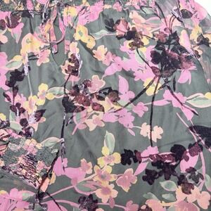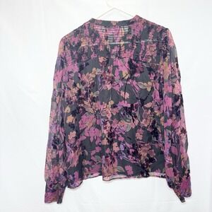 This Evereve floral blouse blends romantic style with subtle drama. Semi-sheer black fabric with flocked velvet florals in rich jewel tones gives it a moody, elegant vibe. Features include shirred smocking at the shoulders and cuffs, a split neckline with tie detail, and lightly puffed sleeves for soft volume. Lined through the body.