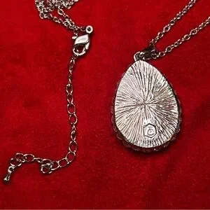 Touchstone Crystal by Swarovski brand signed Montana Drop pendant necklace. Pendant features large pear shape deep ‘Montana’ blue crystal set in silver tone with white crystals around setting, 1.25” x 1” at widest. Chain length 31” with 3” adjustment.