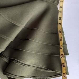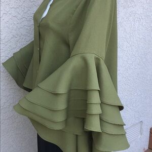Reposhing this item I purchased from @caseystanfield. This statement blouse is in a deep army green and has a stacked sleeve of circle ruffles. It buttons from collar to near hem, and has some weight to it due to the next of the sleeves.
