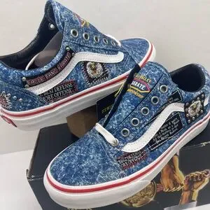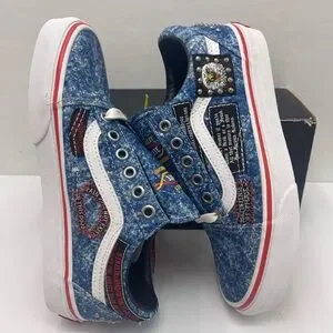 Stylish blue denim sneakers featuring unique patches and white accents. Perfect for casual wear.
