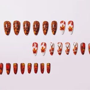 Beautiful nail art featuring autumn leaves and a deer design. Rich colors with glitter accents.