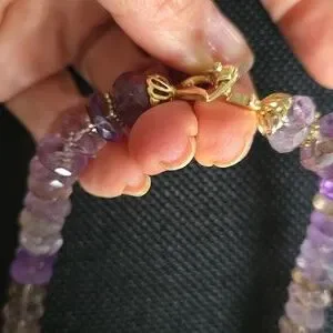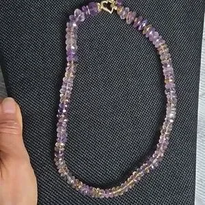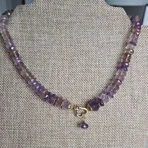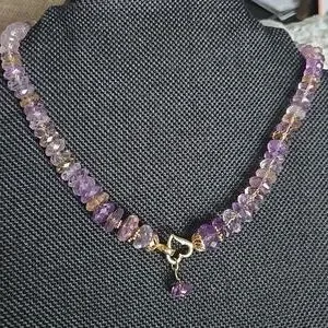 This is a beautiful strand of graduated faceted Ametrine strung using a 14kt gold heart clasp and findings. Can be worn with the clasp in the front or back. Approximate length is 16.5 inches. Handmade, one of a kind vintage piece.