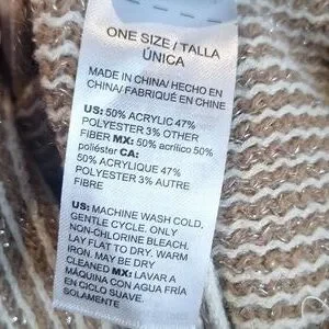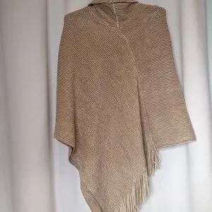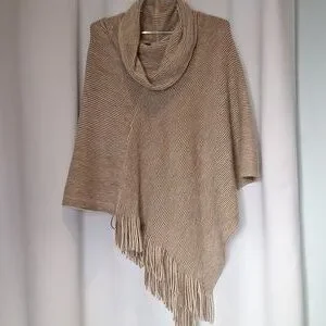 this Chico's one size poncho has cow neck with fringe edging, it is cream and tan stripe with metallic silver threading
