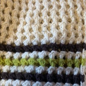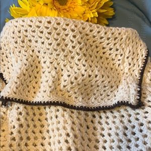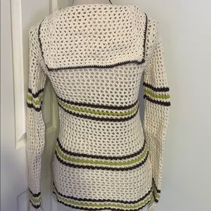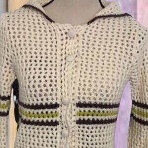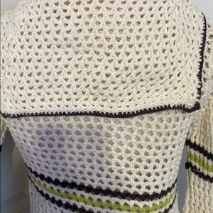 ~material buttons~back top flap overlay with trim~long sleeves~stripes making this stand out~the crochet design throughout