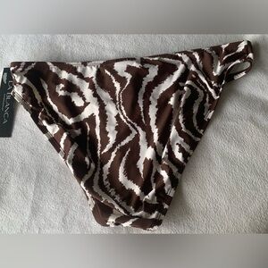 Stylish bikini bottom with a zebra print design. Features a mix of brown and white colors.